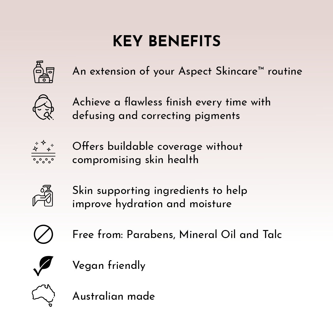 Following Aspect Minerals Primer, Apply to centre section of face using fingers or kabuki brush, blending outward on the face and under the jawline. Build on application as required.