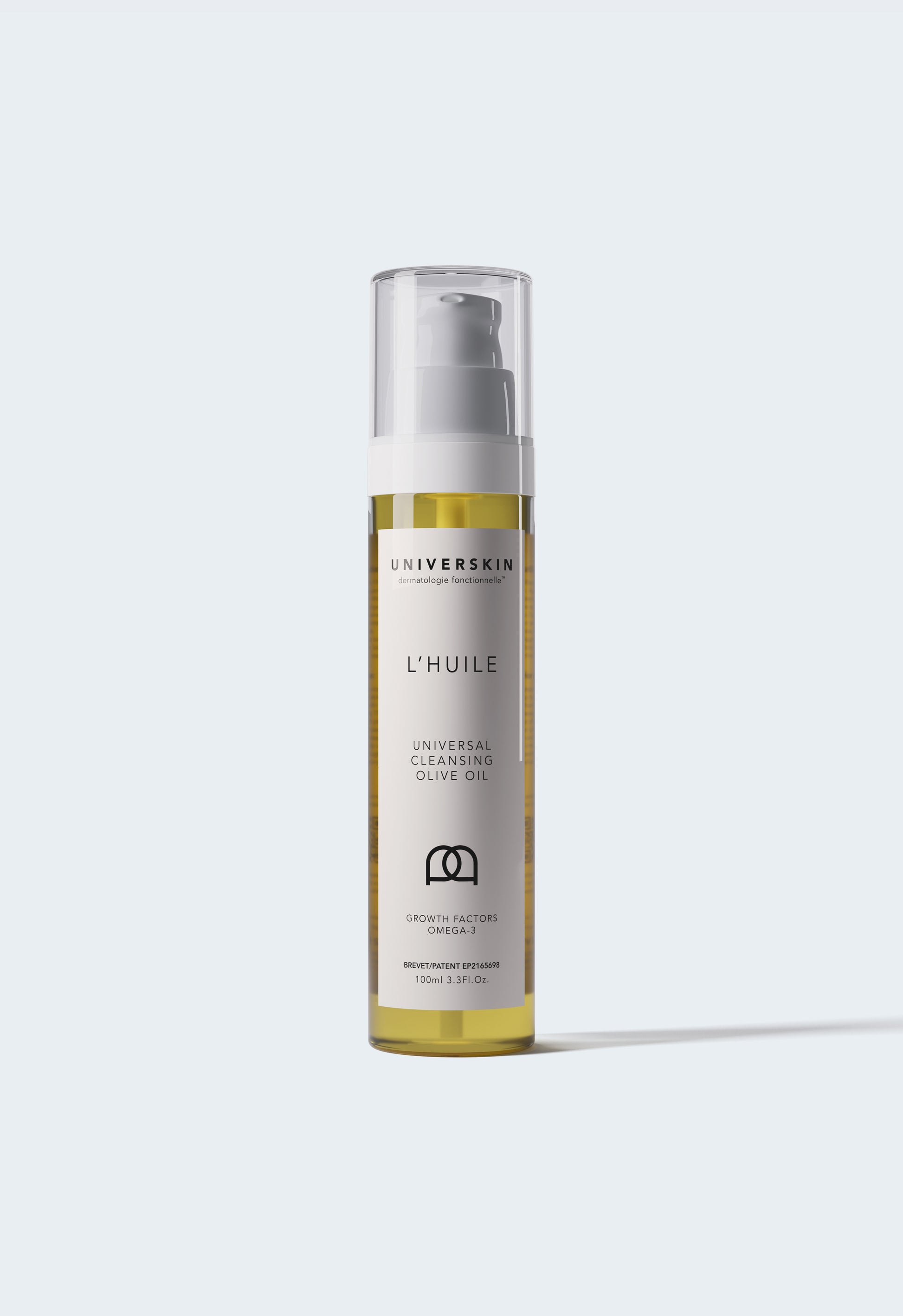 Cleansing is the cornerstone of any skincare regimen and THE OIL (L'huile in French) offers the ultimate solution. Say goodbye to the complexity of "double cleansing" as our all-in-one oil cleanser effortlessly removes makeup, dirt, and impurities while soothing and purifying the skin. Transforming from oil to milk, our self-emulsifying oil has a patented formula enriched with 70% certified organic extra virgin Olive oil and omega 3 – rich Camelina oil, and growth factors. It effectively cleanses, hydrates, and protects against external aggressors. Free from harsh additives, THE OIL addresses a wide range of skincare needs, delivering remarkable results on all skin types, especially mature skin, dull skin, and those prone to acne and blemishes. It also provides relief for irritated and itching scalps.